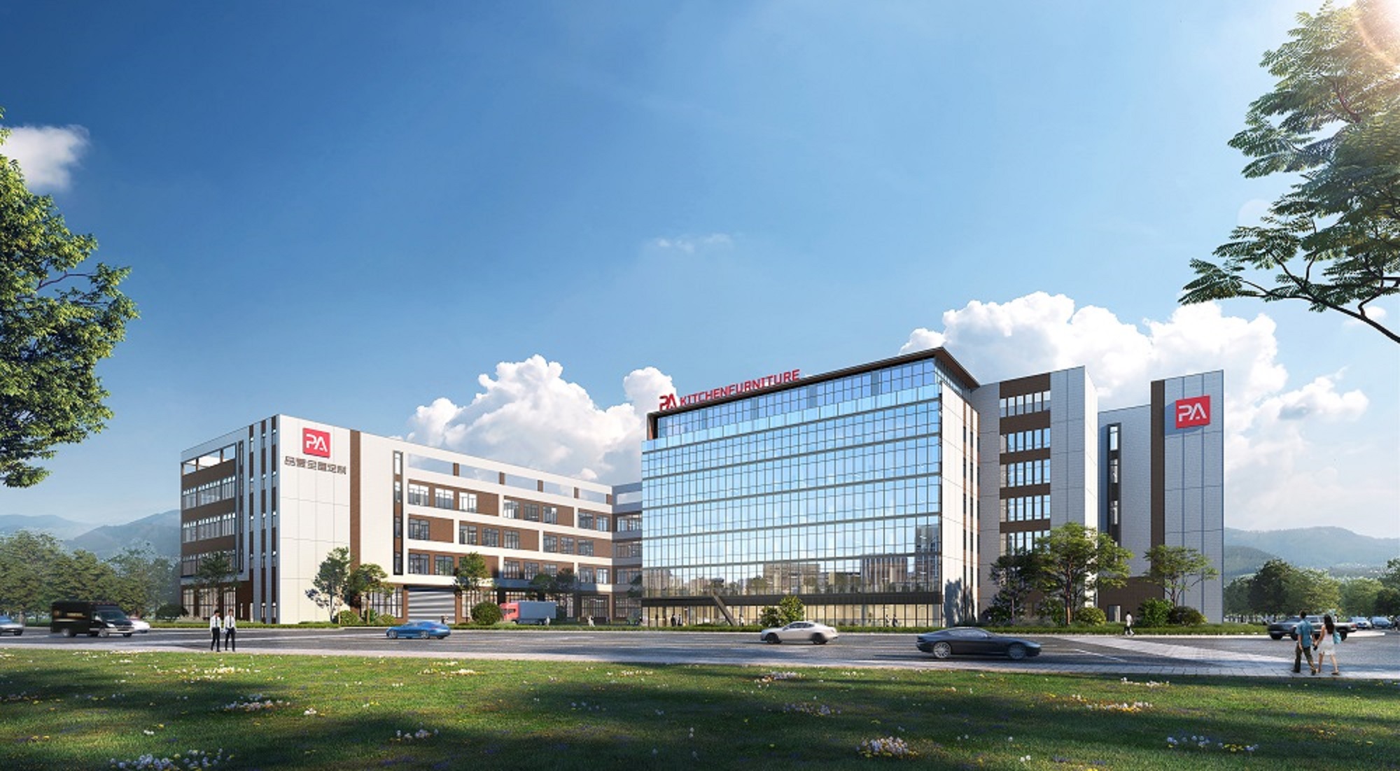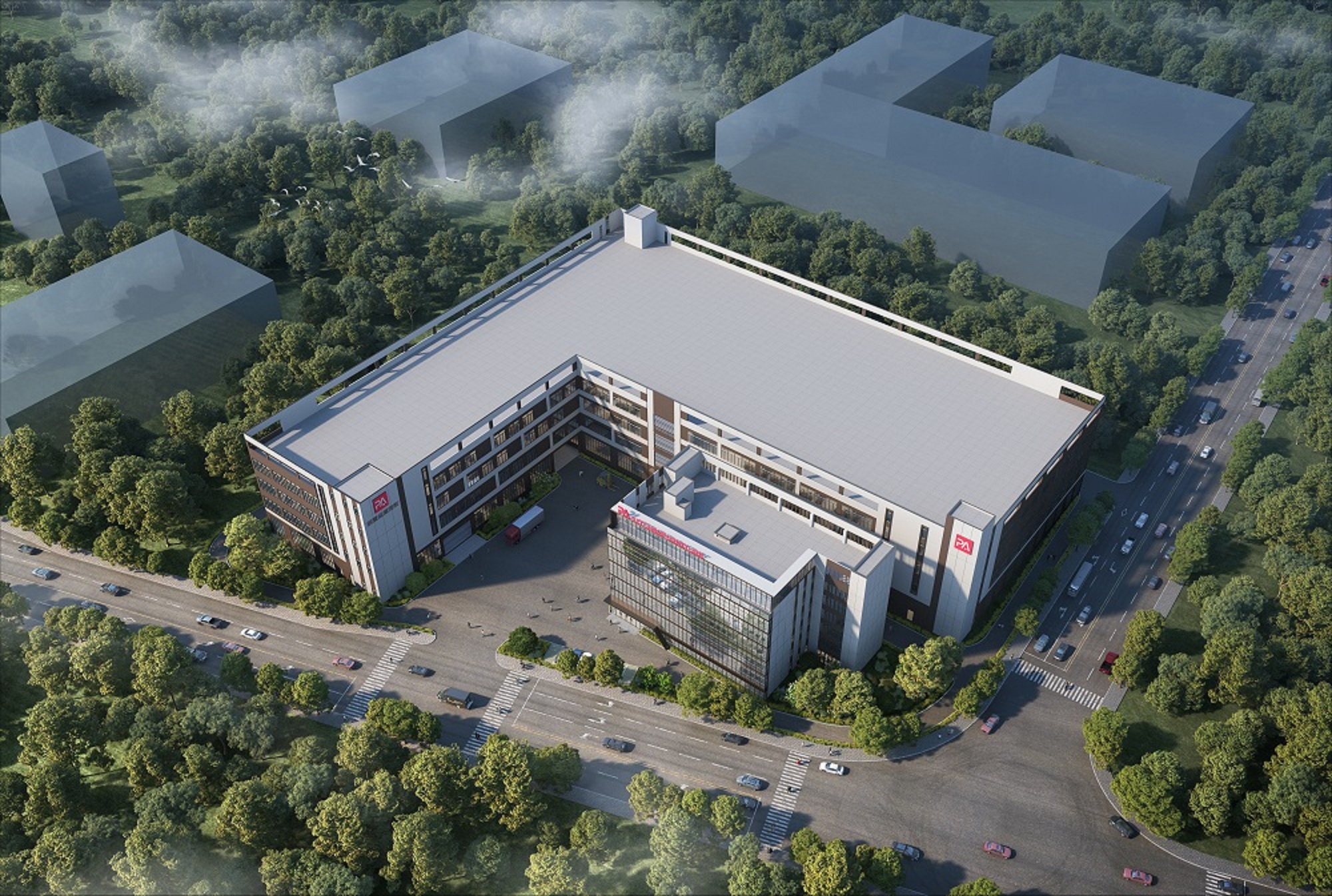 从建筑形态上看,研发楼与生产车间两大功能区域通过现代化的建筑语言相互融合,形成简洁而大气的整体形态。研发楼以玻璃幕墙与钢结构为主体,造型简洁流畅,通透的外立面让建筑与自然环境和谐交融。生产车间则采用大跨度的结构体系,空间宽敞,符合现代制造业对空间的高要求。通过大开间和高顶设计,车间内的生产区域既能满足高效生产的需求,又能够为员工提供舒适的工作环境。